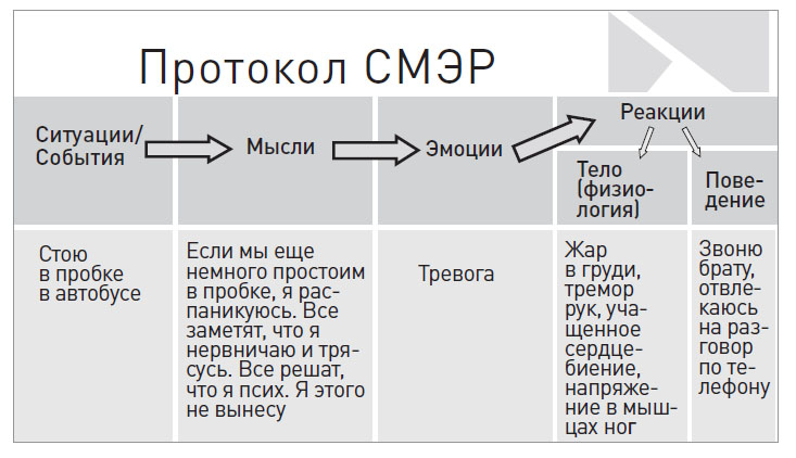 Сокращенно назовём его СМЭР, что расшифровывается как «ситуация-мысль-эмоция-реакция». Поначалу может показаться, что техника это слишком простая и монотонная. Но, раз за разом описывая свои мысли и состояния, мы поймете, что это работает «на отлично». Начав вести дневник, вы сможете отследить свои когнитивные искажения, понять, как ваши мысли влияют на эмоции и реакции в теле, на ваше самочувствие. А опровергая искажения – взять свою тревогу под контроль.