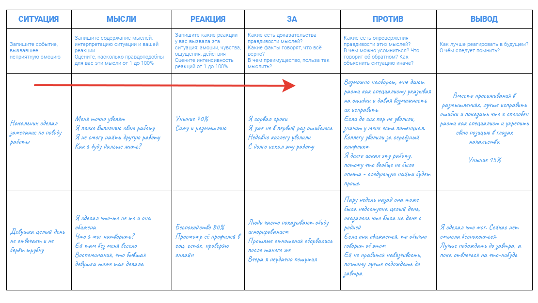 Следующий шаг – оспариваем иррациональные мысли. Добавляем столбцы «за» и «против», в которых пытаемся заменить возникшие у вас мысли на более рациональные и предположить, как изменилась бы ваша реакция, будь мысли о событии иными.