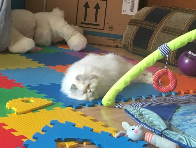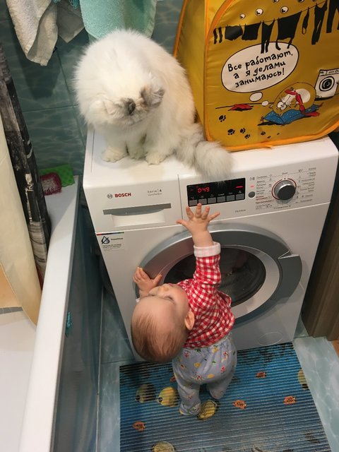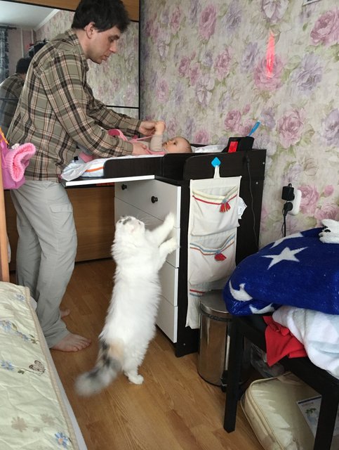 Всем мяу. Хозяйское тиранство проявляется все сильнее. Сегодня мы с малышом очень весело играли в догонялки. Я манила его своим хвостом, а потом убегала. Малыш с хохотом бежал за мной. Потом я шустро проскальзывала мимо него, снова манила хвостом, и игра продолжалась. Нам было так весело и интересно! Но хозяева внезапно заявили, что ребенка нужно срочно вымыть и сменить подгузник. И они забрали детеныша. Тщетно я вопила возле пеленального комода и требовала немедленного возвращения партнера для игр. Хозяева продолжали делать свое грязное дело, и отпустили ребенка только после его завершения. Игру мы, конечно, продолжили, но это было уже не то. Кураж ушел. Обиделась на всех и ушла спать.