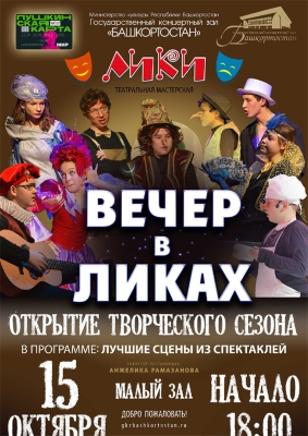Театральная мастерская «Лики» приглашает на открытие нового творческого сезона. Вас ждет увлекательное театрализованное представление «Вечер в Ликах». Вы увидите лучшие сцены театральных постановок коллектива, а также сможете сами стать участниками импровизированного небольшого спектакля.
